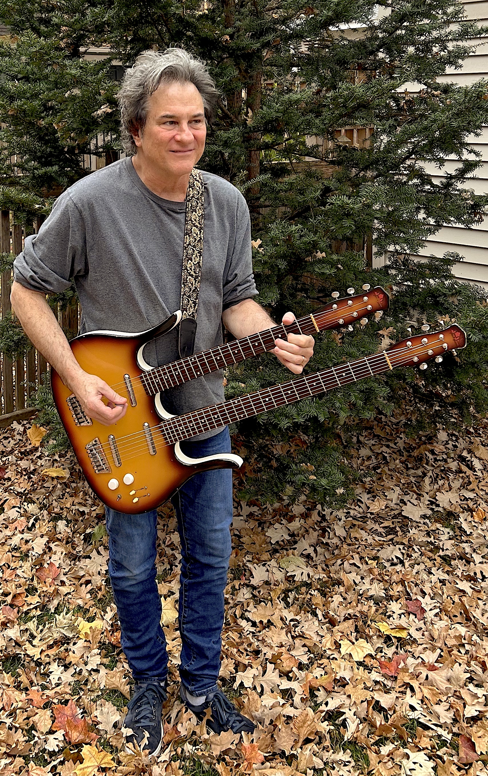 On the last session of the new GB Leighton album, my good pal Brian Leighton gifted me this double neck Jerry Jones beauty. This was Andy Dee’s main weapon for many, many years until his passing. I hope to make it roar once more but it will always be Andy Dee’s guitar.